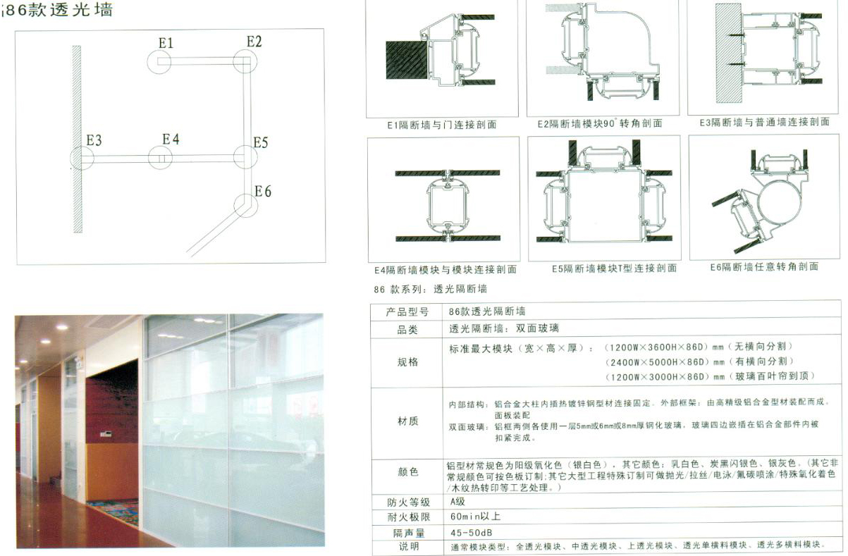 86高隔斷是最為成熟的產(chǎn)品,已經(jīng)做過很多工程案例,深得廣大客戶認同和喜愛,它的任意拆裝,靈活多變地空間劃分組合,自由吊掛隨意的材質搭配,把辦公空間的藝術之美演繹的淋淋盡致。 鋁框中間橫向壓條為17mm,豎向壓條為13mm,上下槽為65mm,左右壁槽為:65mm,側柱為20mm。